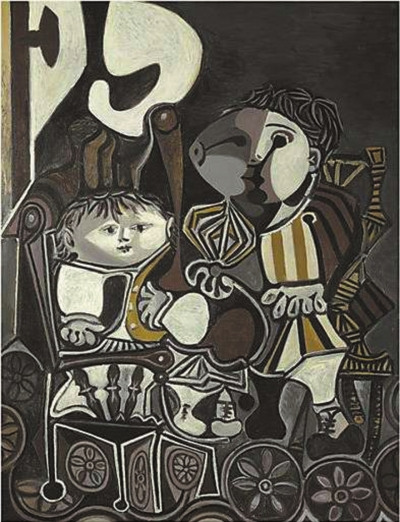 1946年以后都可稱為畢加索創作的田園時期,這一時期的藝術特點仍然以立體主義、現實主義和超現實主義手法相結合的非具象畫為主,手法運用更加靈活嫻熟。這件《兩個小孩》畫面中的人物一個坐姿,一個站姿,眼光直視畫外觀眾,臉部表現帶有明顯的立體主義風格,造型雖有夸張,但在畢加索的作品中并不算是最激烈的變形,筆觸運用也相對精致周到。畫面沒有強烈、跳躍的色彩對比,棕褐色的調子在視覺感受上統一和穩定,而畫面底部的一排圓輪,又使整體寧靜的氣氛中產生了運動感。畢加索一生創作作品數萬件,很多作品都是以其家人或情人為模特,風格也變化多樣。這件《兩個小孩》可以說是以其兒女為模特精心創作的代表作品,畫面的線條組織、色塊布局都有著事先的考量安排,而非在繪畫過程中偶發或即興的發揮,畢加索式隨意而奔放的筆觸在這幅畫中,也只能在局部放大的時候才能讓人感受到。