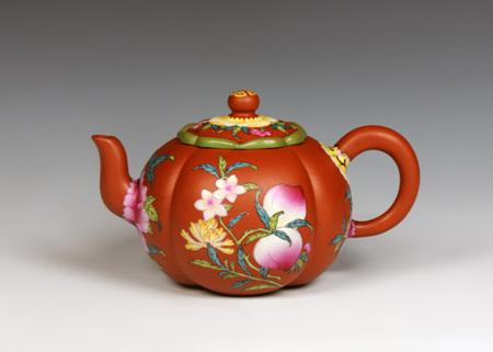 釉彩工藝是將紫砂工藝與景德鎮(zhèn)瓷器釉上彩工藝結(jié)合起來(lái)的產(chǎn)物。它是在已經(jīng)燒成的紫砂陶器上施加釉彩,再以低溫紅爐二次燒成。釉彩裝飾可以分為爐鈞、琺瑯彩、粉彩、描金等。