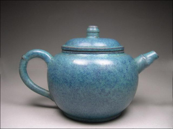 此乃沿用景德鎮(zhèn)陶瓷業(yè)的口法,指在燒成的紫砂器周身施滿含銅或含鉆釉料,經(jīng)低溫二次燒成,釉面呈現(xiàn)鈞瓷特征。《景德鎮(zhèn)陶錄》載:“爐均釉,色在東窯、宜興掛釉之間,而花紋流淌變化過(guò)之。”可知當(dāng)時(shí)稱“宜興掛釉”。爐鈞釉紫砂器始于清代雍正朝,曾有發(fā)高梁紅色的。其后,以淺藍(lán)色為主。據(jù)《陽(yáng)羨砂壺圖考》作者之一張虹說(shuō),爐鈞釉有“雙、單皮之別”,即上一層釉、兩層釉之別,“雙皮者潤(rùn)澤如膏,光可鑒人”。爐鈞釉紫砂壺?cái)?shù)量極少,收藏價(jià)值很高。