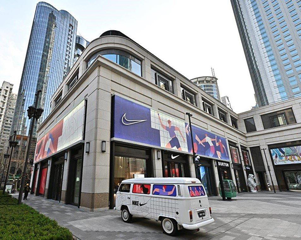 上海的Nike Live店選址鬧中取靜的興業(yè)太古匯,幾乎獨(dú)享商場(chǎng)南花園的開(kāi)闊廣場(chǎng)。這家店的外部形象設(shè)計(jì)是在既不改變建筑整體框架,又能展示自身特色的方案中實(shí)現(xiàn)的:在外立面基礎(chǔ)上增加整幅網(wǎng)狀畫(huà)面,以取代原本分割成小型模塊的海報(bào)空間。Nike的大幅鏤空Logo與標(biāo)志性插畫(huà)連成一體,提升了整個(gè)環(huán)境的藝術(shù)與運(yùn)動(dòng)氛圍,呼應(yīng)了Nike Live打造“家門(mén)口的運(yùn)動(dòng)社交場(chǎng)”的想法。