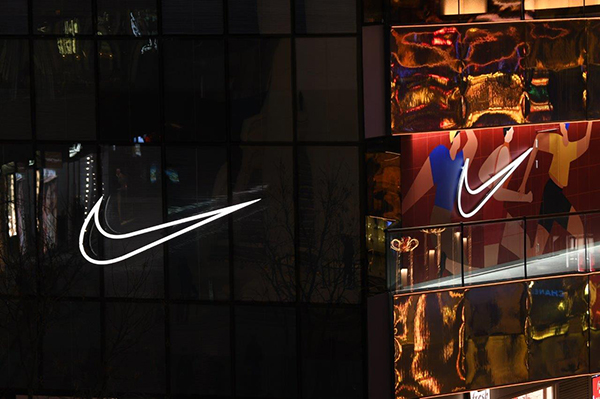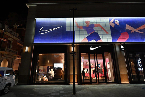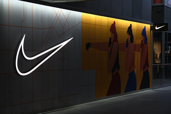 北京的Nike Live店位于太古里商場(chǎng)二層,店鋪外墻有兩個(gè)鏤空Logo,分別寬3米,一個(gè)襯在商場(chǎng)玻璃外墻之上,一個(gè)以本店的藝術(shù)插畫(huà)為背景。白天,即便站在百米開(kāi)外的遠(yuǎn)處,也能一眼發(fā)現(xiàn)Nike的Logo。待到傍晚,華燈初上,在商圈或明或暗、變幻閃爍的彩燈和其他店鋪Logo的包圍之中,Nike Live店的Logo仍然是黑夜中最亮眼的存在。而且Logo的光線柔和均勻,也不會(huì)像單純追求亮度的大幅光牌那樣造成光污染。