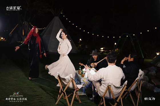 從太行流動(dòng)藝術(shù)團(tuán)開始,火舞表演將多元文化及廣褒的宇宙指引融匯在活物之中,引領(lǐng)人們穿越時(shí)空回到遠(yuǎn)古部落時(shí)代,感受自然的純粹之美。在這個(gè)原始又充滿生命力的時(shí)空里,各民族的祝酒歌此起彼伏,祝酒舞你來我往,漢族、佤族、彝族、苗族、拉祜族、怒族……圍爐煮酒共盛會,盡興不歸樂不疲。