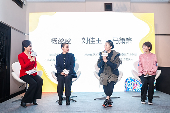 圖:左起:主持人徐靚、設計師楊盈盈、藝術家劉佳玉、非遺匠人馬簫簫在“約會天才媽媽——形之所向”非遺時尚實驗室啟動日對談環節現場