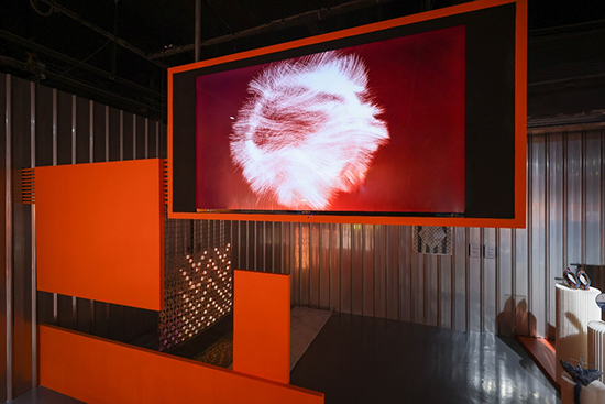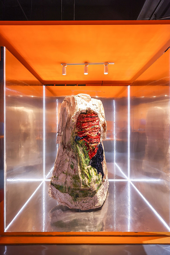 此次主題項目的“銀色試鏡”單元采用反射感與堅韌屬性并重的銀色材質將空間完全包裹,營造出兼具未來性和時尚感的體驗空間。藝術家與設計師從各自視角出發,以日常生活、民間藝術,以及自然生態中的體驗與反思為起點,通過不同媒介材料、視覺隱喻,共同探討女性視角中的文化建構。于惋寧的“可口YUM”裝置系列作品將廚房與廚具的功能性剝離,并變作日常卻陌生的飾品,充滿超現實感;李雨山與周俊的作品《O 80cm》從女書文字出發,呈現語言文化在時間流淌和歷史輾轉中被傳承的印記,以經由放大、重構,仿若圖騰般的文字寓意彼時社會中女性的思緒和力量;在徐子薇“我的身體,略微大于整個宇宙”系列作品中,去身份化的人物形象經藝術家重塑,通過光與鏡面的配合呈現,將身體作為探索本源的媒介;分號C的《交流》通過聲音影像裝置展現了記錄女性生活難以言說印記的女書;劉佳玉的《造形》使用來自adidas by Stella McCartney的回收衣物面料,融合環保樹脂,意在強調可持續的“再利用”在社會發展中的可能性,引導觀眾透過表象感知事物本質,希望喚起更多人對可持續“再利用”的認同。