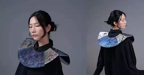 首飾設計作品《藍》的靈感來源于江蘇南通傳統非遺文化——藍印花布。整套作品的外形結構和佩戴方式靈感來源于古玉璧和傳統服飾。告別傳統藍印花布的制作材料和現成品,運用鈦、銀等金屬材料和有色亞克力的結合,以呈現藍印花布中最具特色的白底藍花和藍底白花。光線作用下,背底的亞克力板面上倒映出圖案和光影;再結合悶鑲鉆石的折射會豐富視覺上的層次;強調原有花紋中葫蘆、蓮花等吉祥圖案的美好寓意。整套作品的設計從藍印花布的基礎制作工藝上著手,結合金屬、鋯石、亞克力等現代材料,從傳統面料上剝離,將非遺文化活態化呈現,使其更具當代美學意味。