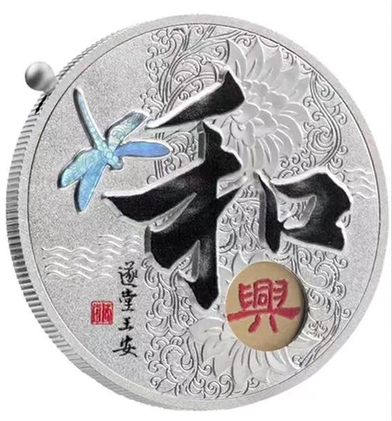 書法章正面圖案背景由成都印鈔有限公司的青年設計師黃琴設計,黃琴為2021年2月獲得“2021年度世界硬幣大獎“最佳金幣獎”中國書法藝術(隸書)8克金幣的設計師。該紀念章正面背景的設計黃琴選取了盛唐時期纏枝紋樣荷花,繁復華麗,高貴莊嚴,體現盛世氣象。黃琴在設計上以盛唐之荷映襯我們國家當下和諧社會之和,以大唐之興盛喻示我們國家的昌盛富強。“和”字左上角一只五彩斑斕的蜻蜓使得章面充滿動感之美,成為點睛之筆,黃琴表示這是取自“小荷才露尖尖角,早有蜻蜓立上頭”之意,再次與“和”字及荷花相呼應。而蜻蜓的姿態,展翅的角度,身體的顏色,黃琴畫了幾稿才確定,其間王安先生提供了眾多參考意見,才有今天呈現出整個章面和諧生動的布局。