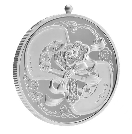“興利中國”書法工匠章的背面圖案是一錠銀錠上以彩緞縛系一柄如意與一支毛筆,取“必定如意”的吉祥之意。與以往不同的是,在設計視角上,黃琴選用了不多見的俯視角度,毛筆與如意的花紋裝飾精美,線條圓潤流暢。在銀錠的設計上,黃琴還分享了一則趣味小故事:古代鑄錢都需先將幣樣呈送皇帝御覽,幣樣為未開口的方孔銅錢,稱之為“金口未開”,待皇帝批準后,方可批量鑄造為開口的銅錢上市流通。“興利中國”書法工匠章背面銀錠上的銅錢通過噴砂與鏡面結合的工藝,使其具有層次立體感,成為“金口已開”的貴金屬精品。