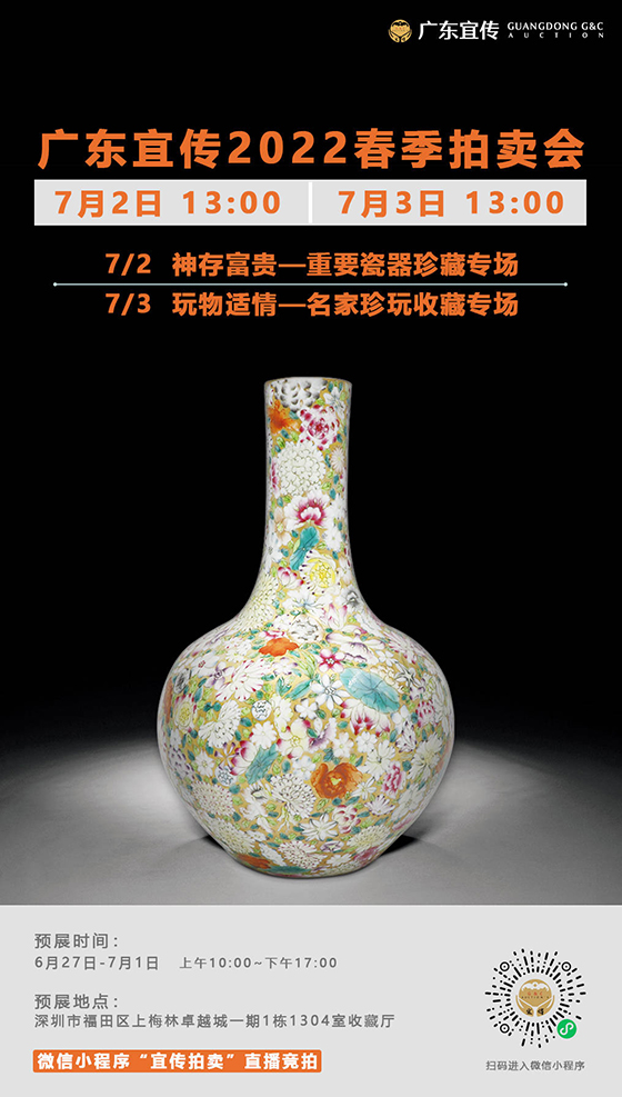 廣東宜傳春季拍賣會將在7月2日下午1點準時開拍!客人歡迎使用「同步代拍服務」于線上參與競投,或透過電話委托、現場競投等方式參與拍賣,祝各位順利將心儀拍品收入囊中,如有拍品需要咨詢,可與我司工作人員聯系!