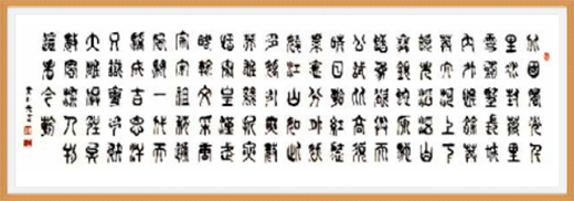 不遺余力修文化,功成高古傳龍脈。他的篆書整體觀感結體中正端莊,用筆平穩流暢,墨顯氣韻生動,在簡捷爽約中寫氣魄宏大,舉重若輕,流利飄逸。篆書傳承秦風的威嚴,又加注個人書風的雄奇神采,仰觀筆墨入廟堂,徑入強勁最骨力,作為諸書之祖,顯成千古不易之法!
