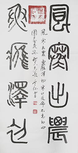 由于工作緣由,書畫作品面世少。其左右手同書、反正書、盲書作品部分高級首長家皆有過收藏,王先生被稱贊為“雙天官”書壇奇人;大幅雙手同書作品、榜書作品中央電視臺、教育電視臺現(xiàn)場直播過;還有些作品曾選登在中紀(jì)委廉政掛歷上;被當(dāng)作國禮送給異國要員的作品如“友誼長存、龍行天下、騰飛”等也不在少數(shù);其它作品有些雜志上亦有登載恕不能盡例。雖然如此,王先生決不敢入江湖下流,做學(xué)生,苦讀勤學(xué)是為本,旨在為人民服務(wù),為發(fā)展中華文化而奮斗。