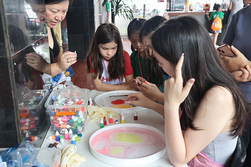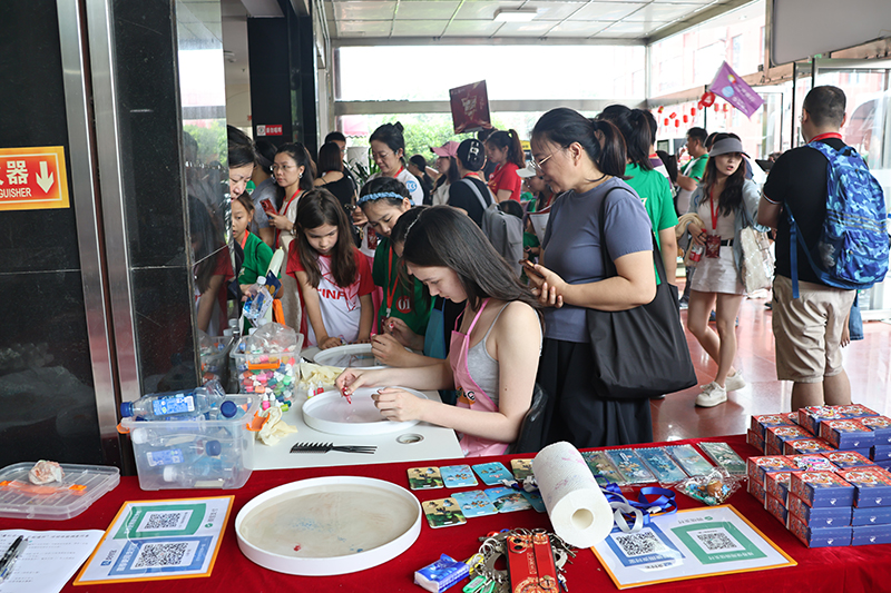 在非遺雕版印刷體驗(yàn)區(qū),孩子們踮起腳尖,在非遺傳承人手把手的指導(dǎo)下,小心翼翼地刷墨、鋪紙、拓印。“哇!我印出來啦!”看著自己親手完成的、帶著墨香的作品,小朋友興奮地向父母展示。帶著孩子前來的張女士深有感觸:“讓孩子親手體驗(yàn)這些書本上的‘老手藝’,比講一百遍都管用。看他這么專注,這么有成就感,真的值了。”一旁的扎染工坊同樣熱鬧非凡,素白的方巾在參與者手中折疊、捆扎、浸染,再展開時(shí),獨(dú)一無二的藍(lán)白花紋總能引來陣陣驚喜的歡呼。市民將親手制作的扎染方巾視為獨(dú)特的活動(dòng)紀(jì)念品,愛不釋手。三個(gè)剛從俄羅斯回國的小華僑,全神貫注的描繪著水拓畫,看著精美的圖案拓印在書包上,小華僑開心的和媽媽說“中國的傳統(tǒng)藝術(shù)太棒了,我要多做幾個(gè)帶回俄羅斯,送給我的朋友們。”