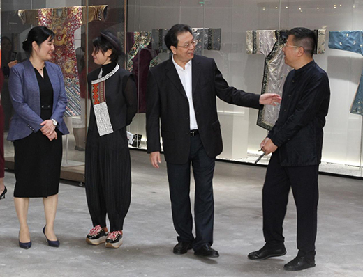 趙卉洲為出席開幕式的領導嘉賓講解非遺織錦展展出民族織錦的時尚化設計表達
