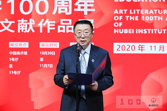 開幕式上,湖北美術(shù)學(xué)院黨委副書記、院長許奮從1920年蔣蘭圃、唐義精、徐子珩三位先賢創(chuàng)辦武昌美術(shù)學(xué)校開始,系統(tǒng)回顧了學(xué)校百年辦學(xué)歷程,講述了百年來湖北美術(shù)學(xué)院矢志美育,始終與祖國和人民共命運(yùn)、與時代和社會相偕行的辦學(xué)宗旨,熔鑄和傳承“兼收并蓄”的學(xué)術(shù)精神和“兼容互動”的教學(xué)理念,以及堅持文化傳承與使命擔(dān)當(dāng),在實(shí)踐中進(jìn)行教學(xué)改革,在關(guān)注時代下服務(wù)社會所做的努力和成就。同時,許奮院長還講到,在下一個百年,湖北美術(shù)學(xué)院將以蔡元培先生題詞“推行美育”為激勵,牢記習(xí)近平總書記“以大愛之心育莘莘學(xué)子,以大美之藝?yán)L傳世之作”的殷切希望,繼續(xù)發(fā)揚(yáng)以藝戰(zhàn)“疫”中與國家和民族共進(jìn)退的“硬核”擔(dān)當(dāng),發(fā)揚(yáng)眾志成城抗擊疫情的壯志豪情和同舟共濟(jì)守望相助的家國情懷,不忘初衷,篤篤前行,進(jìn)一步為中國高等美術(shù)教育事業(yè)貢獻(xiàn)自己的力量。