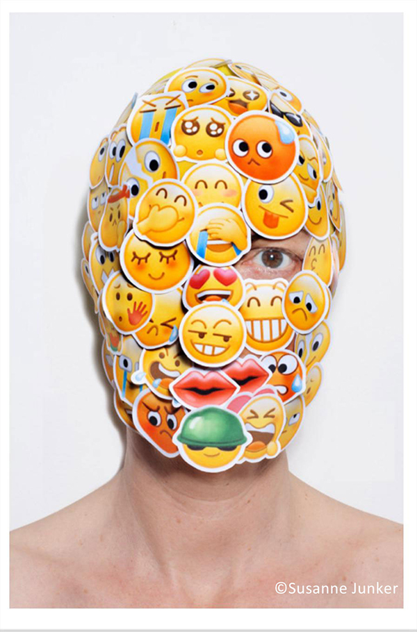 "SELF-PORTRAITS WITH MASKS I – VI" With this new series, Susanne Junker explores the phenomenon of the usage and rise of emojis in our digital world, by adopting an anti-AI approach, by un-digitalising the emojis, printing them on paper, and creating masks of them on her own face. Each mask carries a topic and a conversation, covering Susanne’s entire face and leaving only her bare neck visible, which is representing the self within this self-portrait series.